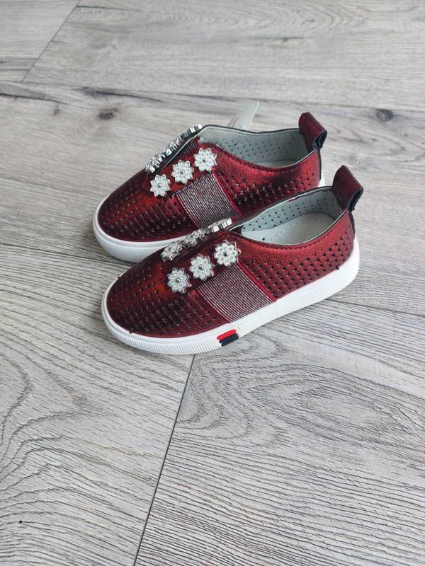 Стильные слипоны для девочки в бордовом цвете. Материал- экокожа в дырочку, ортопедическая кожаная стелька. Размеры: 26-31.