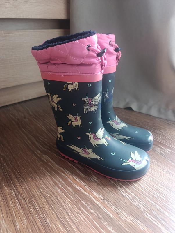 Резиновые сапожки для девочки с принтом единорожков. Середина без утепления но верхняя часть (там где затяжка) утеплена. Состояние хорошее, не протекают, цельные, подошва не вытертая. но есть следы употребления, рисунок местами потертый. Размер 29 стелька 19 см.