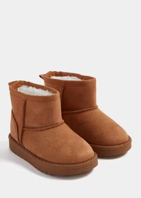 Стильные угги для ребенка. Сделаны из текстильного материала под замш. Внутри - густой искусственный мех. Прочная подошва. Состав: полиэстер, полиуретан.