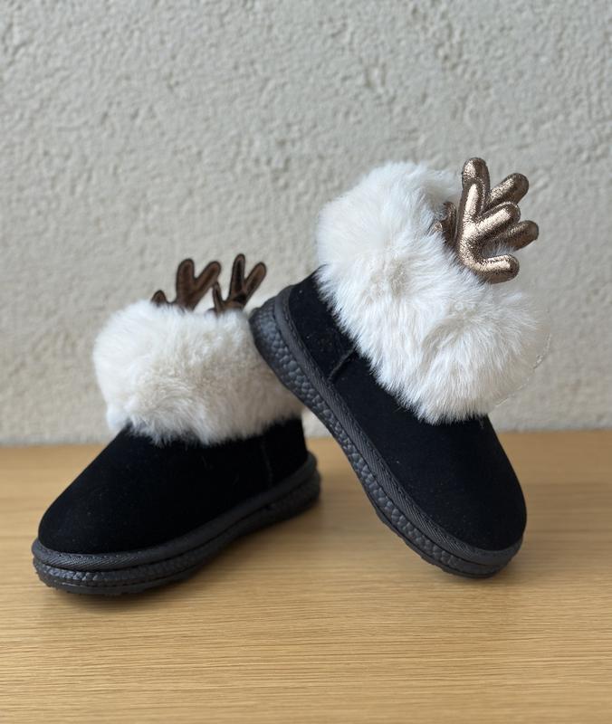 Утеплені черевики (уггі) на дівчинку, 27 розмір, декоровані блискучими ріжками оленя, дуже легенькі, з мʼякою та гнучкою підошвою.