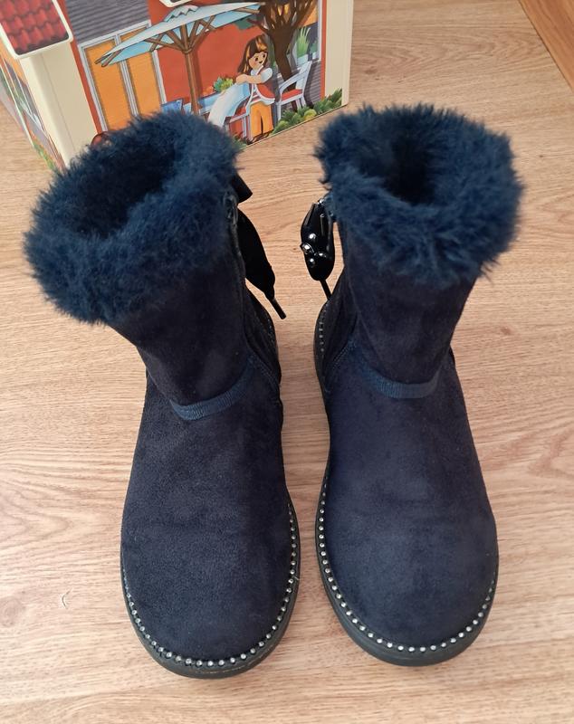 Красивые и удобные Угги на девочку. Очень красиво садятся на ножке. Темно синего насыщенного цвета, без потертостей. Сзади декорированы бантиком с камушками, внутри утеплены мехом. Вокруг подошвы тоже камешки. Застежка, замочек. Стелька - где-то 20 см, не вынимается.