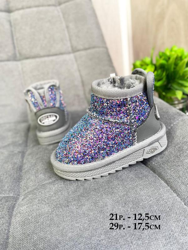 Красивые и теплые угги - ЗАЙКИ. Цвет - серый. Верх прочное глиттерное покрытие - очень красиво переливается. Внутри густой искусственный мех. Сбоку на замочке. Рифленая подошва. 850грн 21р. - 12,5см 29р. - 17,5см Измерение сделано внутри! угг. Похибка 1-2мм допустима.