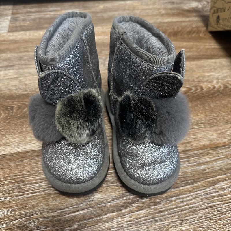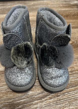 Дитячі уггі сріблястого кольору з вушками та хутряними бубонами. Розмір 28