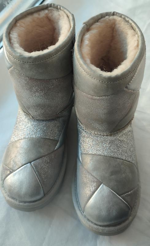 Детские угги серебристого цвета, кожаные, новые. Размер 35, стелька не вынимается, но по длине где-то 20-20,5 см. Высота от пола 19.5см, высота подошвы 2,5 см. Без коробки