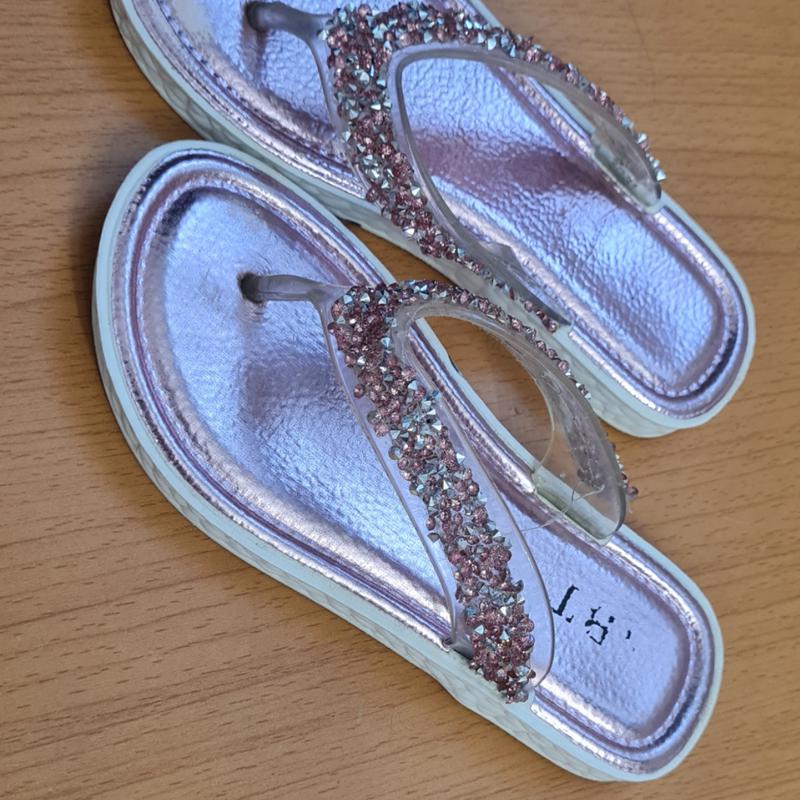Вьетнамки со стразами, на солнце очень красиво блестят, на фото не передается. Внешне как новые, единственное на подошве где большой палец немножко совсем потерлись (последнее фото). При носке никак не заметно. Подойдут на ножку 16,5-17 см