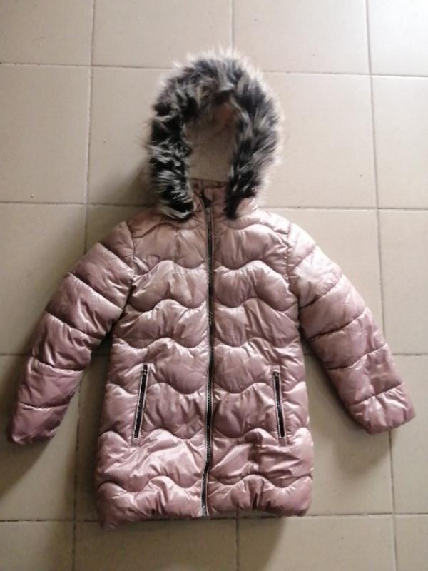 Зимове пальто на дівчинку 7 років, на зріст 122 см. На синтепоні, на штучному хутрі. Довжина 61 см, пог 42 см, довжина рукава 47 см, плече 8 см.