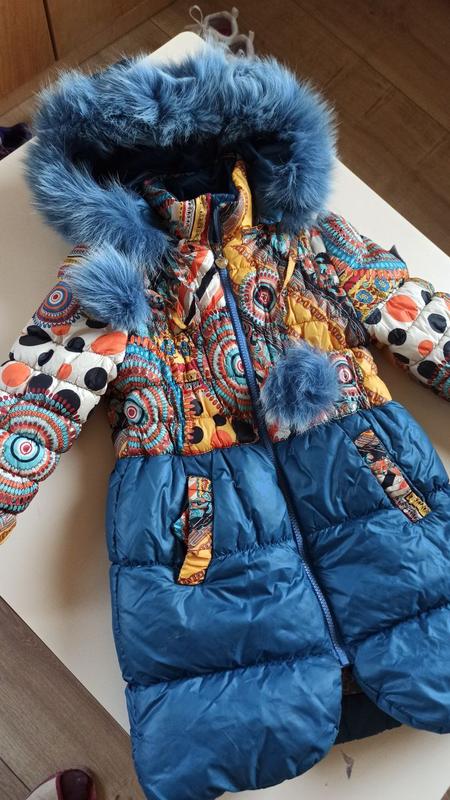 Яркое стильное пальто для девочки. Внутри подкладка из флиса, наполнитель двойной синтепон. Длина 67, рукав от плеча 50см, рукав 32см.