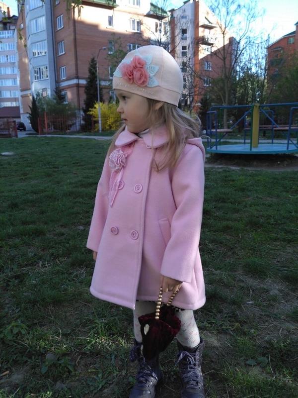 Шерстяно-кашемировое пальто на девочку 3р. Нежно розового цвета, как на первом фото на дочке. Фотографии на синем фоне почему-то не передают реального цвета. Украинского производства. Пальтишко чистое, после химчистки. Купили 1200грн.в магазине.