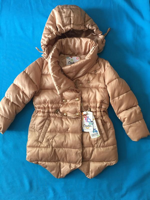 Пальто пуховик для девочки. Съемная шляпа, съемный искусственный мех. Рукава с трикотажными манжетами. Размер 110