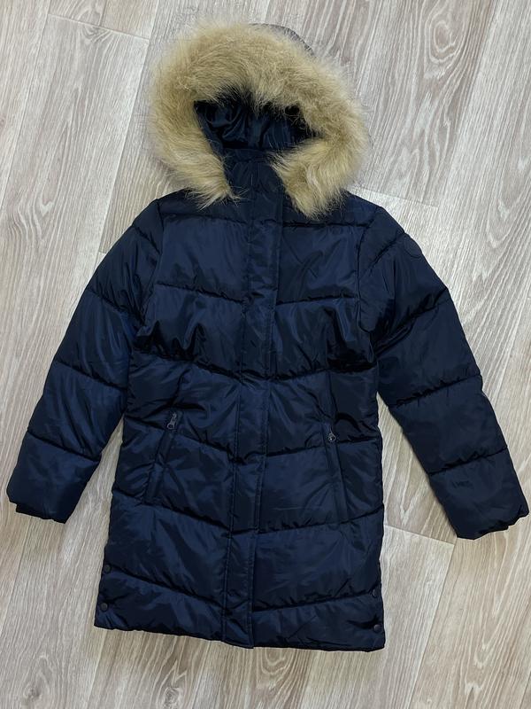 Куртка пальто с пышным мехом Есть теплые карманы Высокий ворот Мех на капюшоне съемный Подкладочная ткань полиестер Манжеты в рукавах Состояние новой без бирок 9 лет/134 Длина 74. Пог 44. Рукав 53