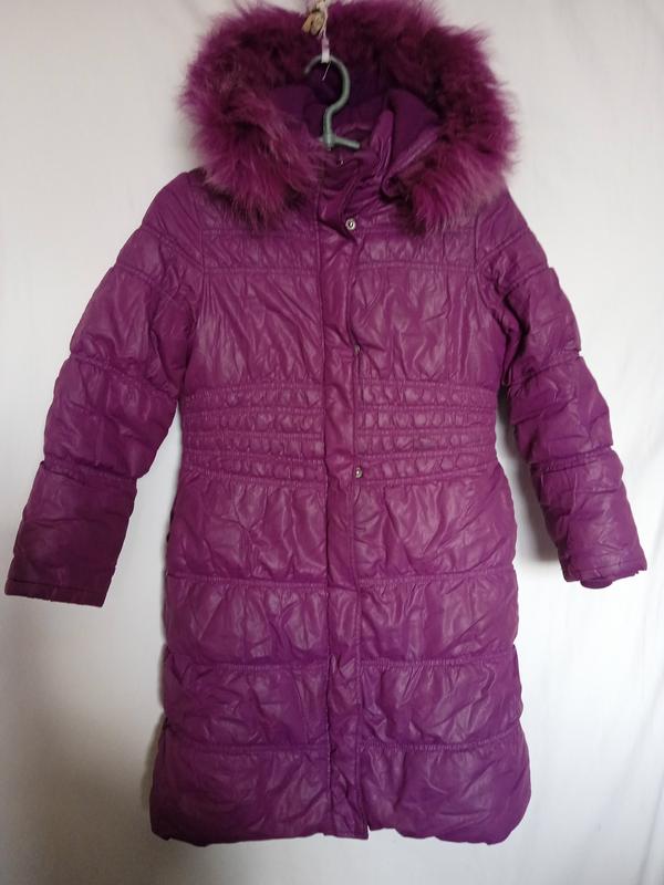 пальто теплое,цвет красивый как на фото, на синтепоне,флис подкладка, мех натуральный,капюшон отстегивается,на молнии, манжеты не вытертые,, не все кнопки работают, основная молния работает хорошо, на бирке написано 9/134см,