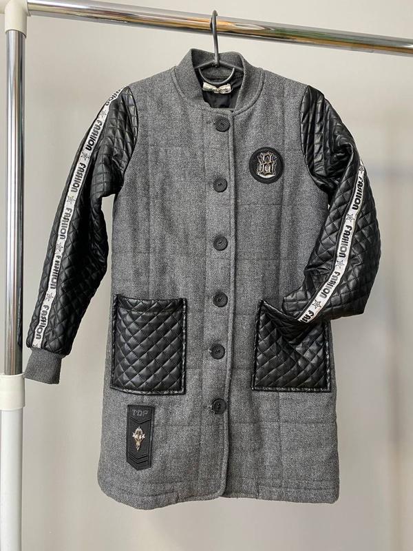 Стильное пальто на подкладке.Рукава, карманы эко кожа. Длина -75 см Рукав от плеча -55 см ПО-44 см
