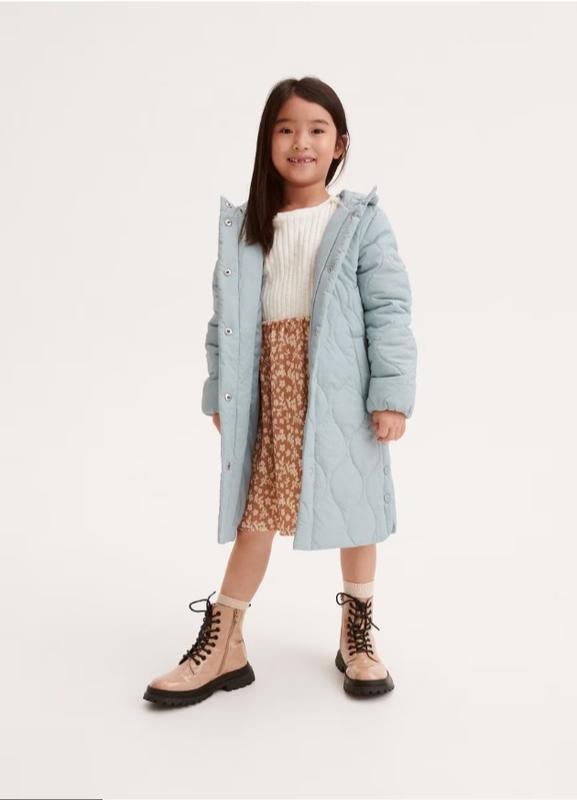 Легеньке пальто на весну або демісезон. Ріст 146см, носити можна і з 140 см. Reserved. Верх плащівка злегка зжата, підкладка тонкий синтепон. Стьобане гарною хвилею. Капюшон місткий, не відстібається. Пальто застібається на міцні кнопки, з боків розрізи теж на кнопках. Низ рукавів на резинках. Дуже гарна трендова куртка пальто. На жаль дитині не підійшло. Заміри при потребі надам. Брала на розпродажі. Переросли. Заміри: Плечі - 37 см Рукав - 59 см Пів обхват під рукавами - 48 см Довжина по спинці - 86 см
