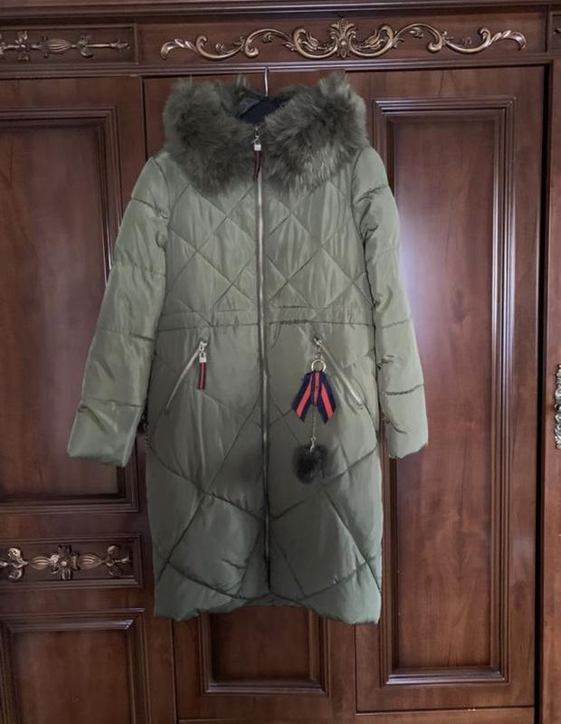Стьобане пальто-пуховик кольору хакі, з капюшоном оздоблене штучним хутром, тепле, на щільному синтепоні. Верх матеріалу- шовковий нейлон. Хутро на капюшоні відстібається. Оздоблене кольоровими стрічками. Застібка на блискавку, всередині резинка на талії, регулюється. Сезон - зима осінь. Тканина верху хорошої якості, щільна, з легким благородним матовим блиском, шовковий нейлон. Розмір - S/М Пог - 48 см Довжина рукава - 58 см Довжина пуховика - 96 см
