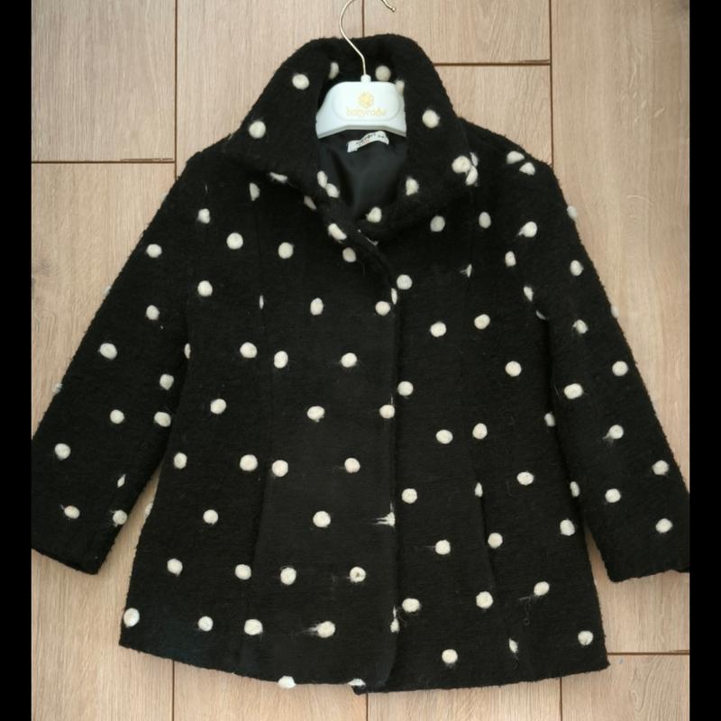 очень красивое и теплое пальто для маленькой красавицы стан правовой размер 3-4 рочки цвет черный с белыми горошинками из овечьей шерсти