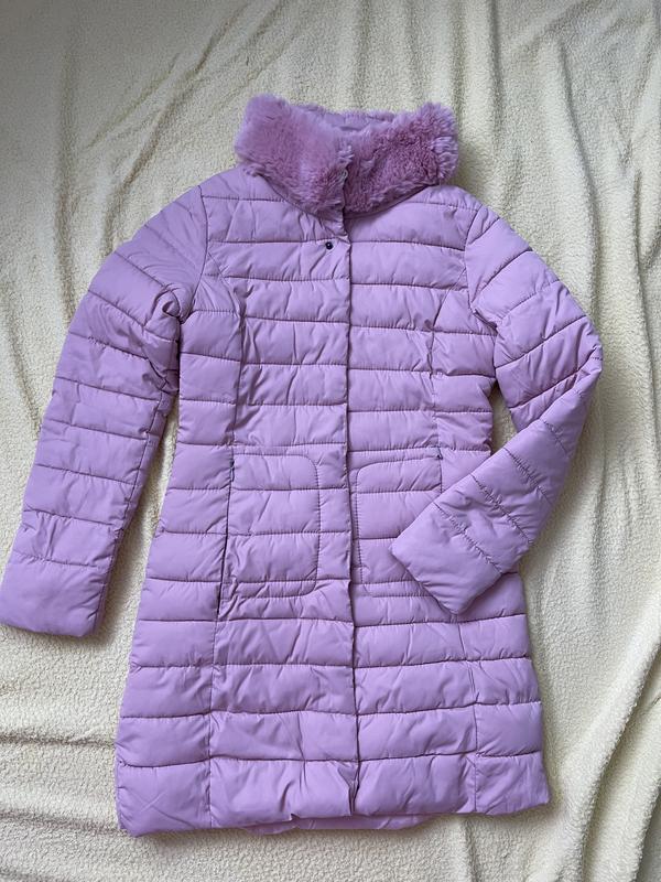 Подовжена куртка (пальто) на стнтепоні, без капюшона, штучне хутро кріпиться на ґудзики, незначні непомітні дефекти - пропуски строчки. Рукав - 61, плечі -38, груди - 46, довжина -82