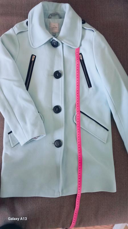 пальто на девочку размер 134-140. состояние нового. цвет нежно голубой. замеры на фото.