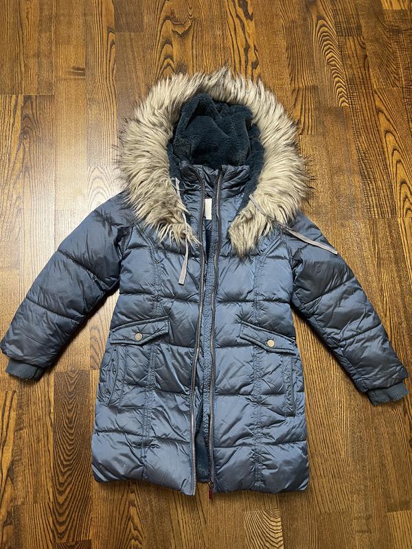 Зимове пальто, по бірці 6 років, донька носила в 5 років. Краще дивитись по замірах (є на фото). 4 кишені, каптур оздоблений штучним хутром.