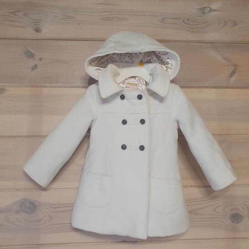 дуже гарне якісне біле пальтішко для маленької дівчинки є замочок і ліпучки... капішон на замочку можна знімати... розмір 2-3р орієнтуватись на заміри