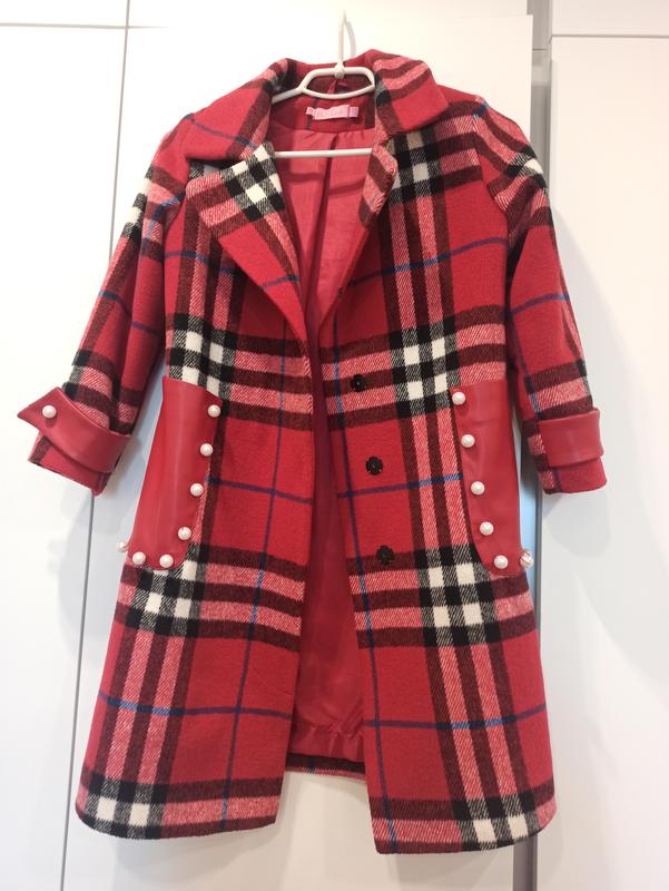 Пальто на осінь для дівчинки від українського виробника. У складі 40% вовни та 10% вона альпаки. 50% акрил. Утеплювач 50, на теплу осінь. Рукава оздоблені ремінцями зі штучної шкіри. Глибокі кишені зі штучної шкіри та перлів. Пальто на кнопках. Є можливість закрити комір на гудзик. Розмір 128, також вистачить на 134