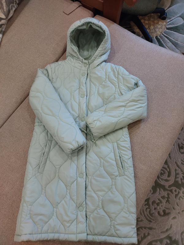 Пальто демисезонное на девочку на рост 148 см, на 11- 12 лет.Стан - идеальный. Цвет- приятный м 'ятный. ( На фото 1-2 ). На плотном утеплителе- до 0 градусов можно носить смело. Застежки-кнопки, стягивается на кулиску, карманы без застежки, капюшон несъемный, рукавчики стянуты на резинку. Очень красивое, комфортное. Удачная вещь в гардеробе ребенка. Замеры: длина- 81 см, длина рукава- 55 см, ширина под проймой- 42 см, ширина от плеча до плеча- 39 см. На запрос есть фото на ребенке. Пригодна вещь личного пользования.