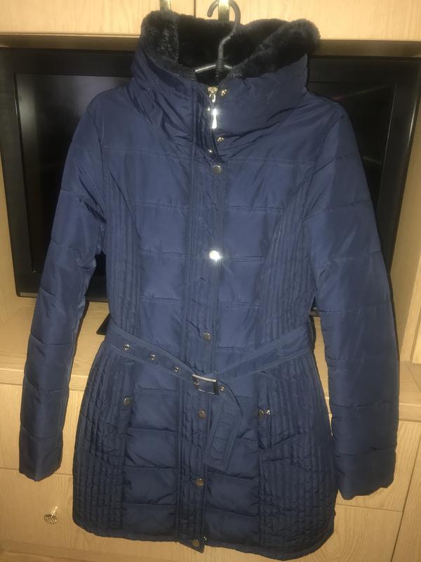 Пальто демісезонне, єврозима, довжина 76, напівоб’єм грудей 48 см. Капюшон схований, пояс знімається. Без дефектів. Колір темно-синій.