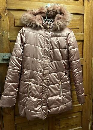 Зимове пальто для дівчинки. Дуже тепле. Хутряна підкладка. Стан ідеальний. Проте через катання по снігу є потертості на самій тканині. На фото відображено. При денному освітленні його майже не видно. Колір ближче як на передостанньому фото. На зріст 146-152