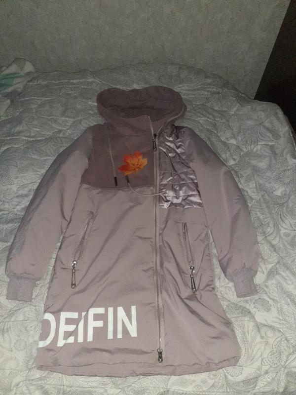 Пальто демисизоне, рукав манжет, капишон стягивается, плащевка+ вставки, рост 140, на 10 лет. из подкладка, утеплитель. На молнии блестящие камушки. очень красиво смотрится.