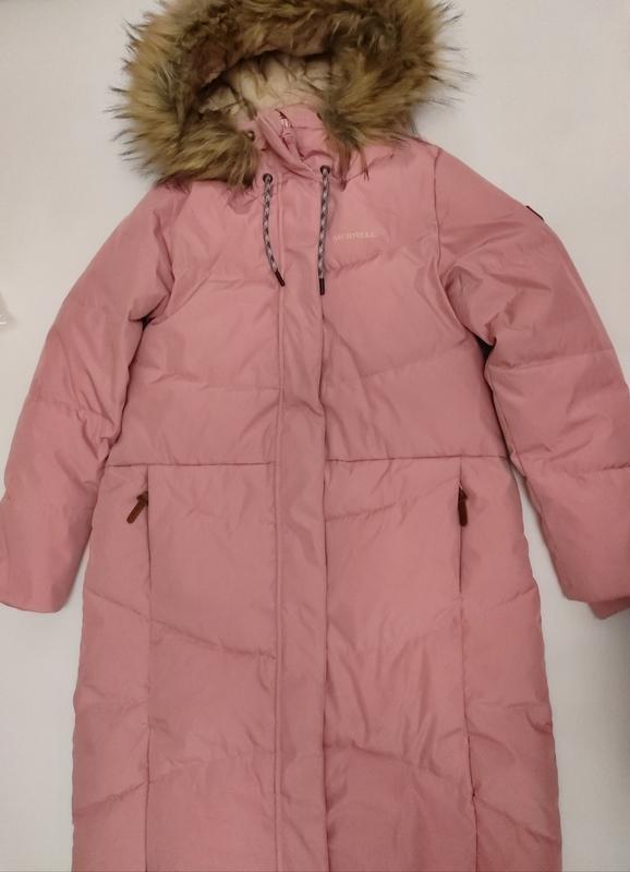 Зимнее пальто для девочки фирмы Merrell, р. 140-146. Состояние очень хорошее, без дефектов. Очень теплое. Длина - 85 см, рукав - 56 см, плечи - 36 см. Капюшон не отстегивается. Мех на капюшоне отстегивается.