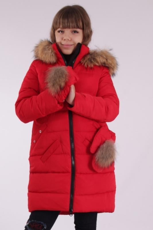 Зимнее пальто на девочку от бренда Кико Anernuo.Размеры 170р.Цвет красный.Наполнитель тинсулейт.Опушка натуральный мех.Капюшон и мех отстегивается. Спереди два кармана ввиде рукавичек. Они отстегиваются. Рукава с отворотом для регулировки длины и трикотажные манжеты для тепла.