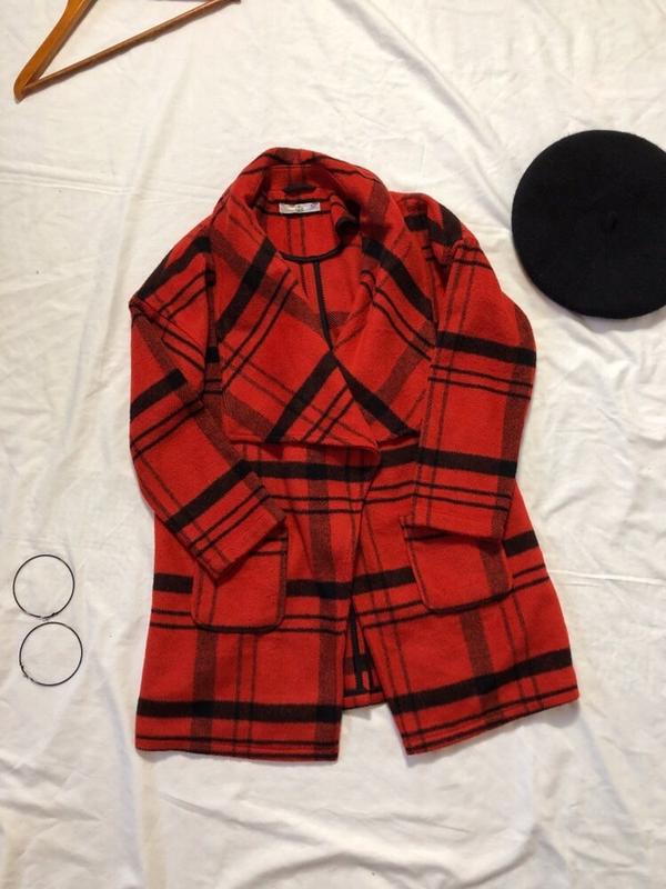 Дуже красиве пальтечко ПОГ-48 см без гудзиків , назарах , можна використать пасок дліна -72 см плечі - 54 см. Приспушені рукав-38 см . Красивий колір і клітка
