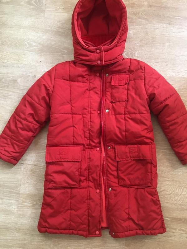 Очень теплое зимнее пальтишко на рост 116-122. Наполнитель синтепон, подкладка на флисе. По бокам молния, что очень удобно. Замеры: Длина 64 см Рукав 41 см Ширина под руками 40 см. Без дефектов, в очень хорошем состоянии.
