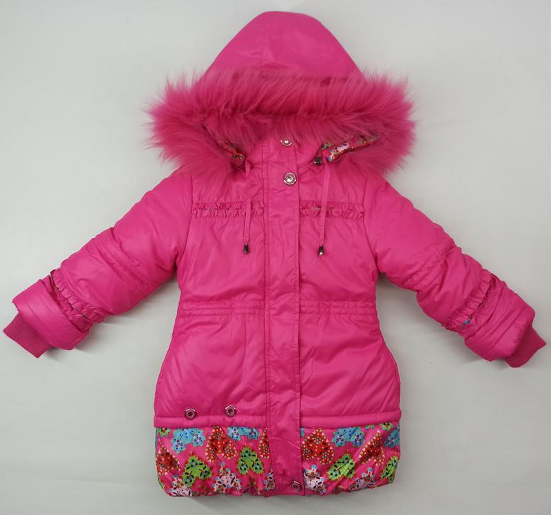 Зимнее пальто для девочки малинового цвета, подклад плотный флис до талии. Капюшон на молнии с натуральным мехом.