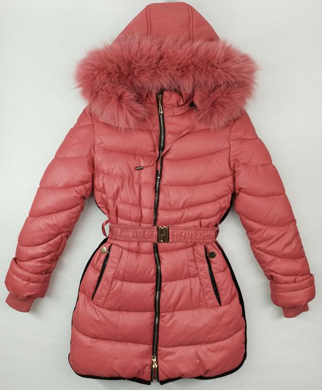 Зимнее пальто для девочки персикового цвета, подклад плотный флис до талии. Капюшон на молнии с натуральным мехом.