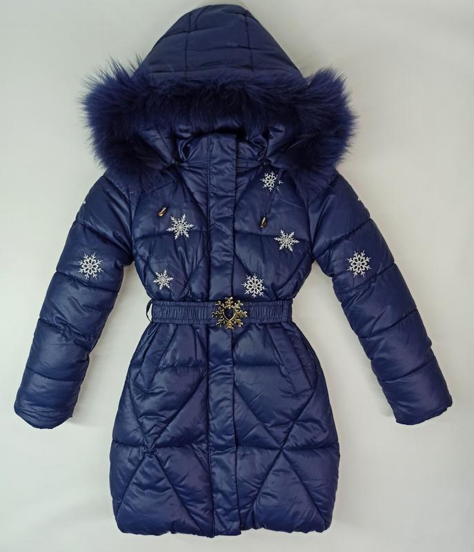 Зимнее пальто для девочки синего цвета, подклад плотный флис до талии. Капюшон на молнии с натуральным мехом