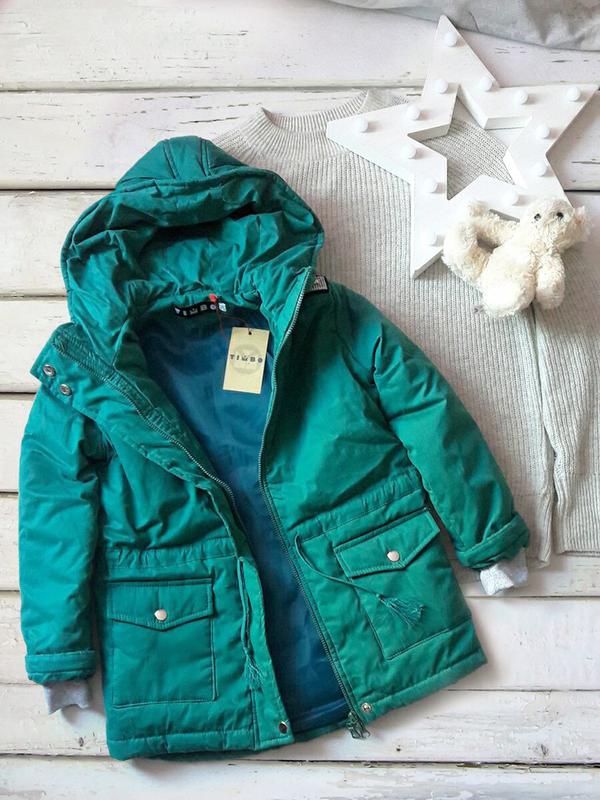 Нова куртка-парку для дівчинки. Прямого крою, фіксується на поясі. Є додаткові манжети (сірі) на резинці. Сезонність: осінь-зима Оригінальна ціна на сайті виробника 650 грн. Знижую ціну, тому що на одному гонитві не вистачає зірочки (під каптуром не помітно), видно на фото 3. Розмір 34, орієнтований на зростання до 130 см, але орієнтуйтеся по замірах! Заміри: Довжина по спинці - 65см, Ширина плечей - 39 см ПОГ - 45 см