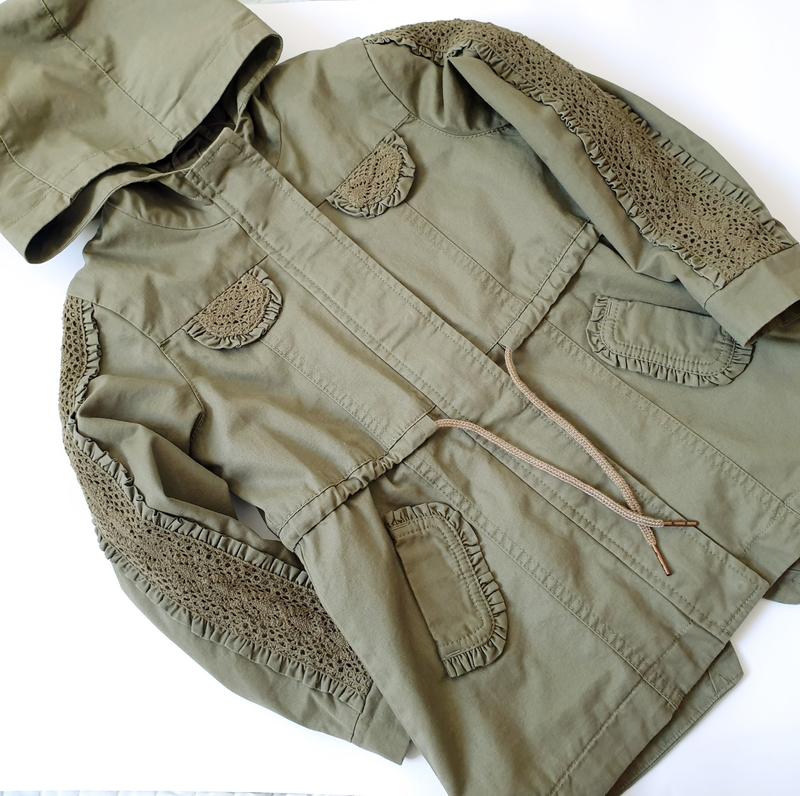 Стильна парка з вставками мережива,є карманчики і капюшон,є тонка підкладка і в рукавах,застібка -блискавка і кнопки, шнурок на талії робочий,по бірці 5-6 років. Довжина 53,5, ПОГ 38, рукав від плеча 42, від горловини 52,5