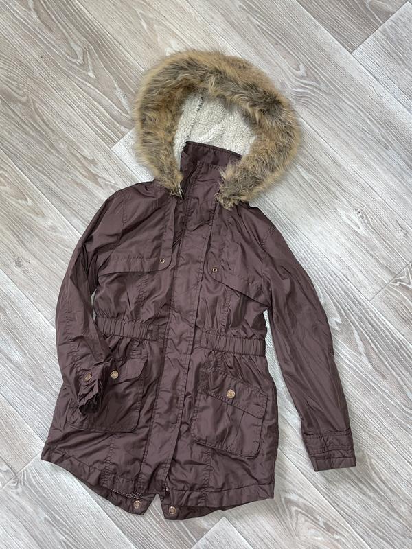 деми парка на тонком слое утеплителя и подкладкой махра на спинке и груди. капюшон не отстёгивается. мех легко расчёсывается после стирки. 8-9 лет длина 63. ПОГ 42. рукав 49