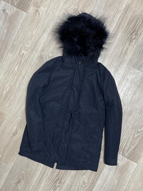 Межсезонная парка Цвет темно-синий Утяжка в поясе Спереди 2 кармана Подкладка махра/стеганка Есть небольшой слой утеплителя Высокая горловина Съемный мех на капюшоне Состояние новой вещи, бирки нет 12 лет Длина 65/69. ПОГ 43. Рукав 55