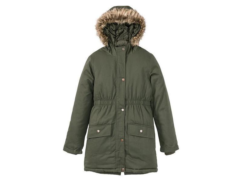 Стильная, мягкая куртка-парка от Pepperts!, Германия. Отличный вариант для холодной демисезонной погоды и теплой зимы. Верхний материал из ткани с водоотталкивающими свойствами благодаря новейшей технологии пропитки материала инновационным составом BIONIC FINISH ECO. Пропитанная таким образом ткань кроме отличных влагоотталкивающих свойств намного меньше подвержена истиранию и загрязнению. Застежка на молнию с защитой подбородка скрытую под планкой с кнопками. Капюшон вшитый, декорирован съемным мехом (кнопки). Внутри утеплитель. Есть два кармана без застежек на груди и два накладных кармана с застежками на кнопки. В рукавах трикотажные манжеты. Сзади характерный для парки разрез. замеры примерно: рост 158 (12-13 лет) хакки Полуобхват груди 48см Рукав 60см + манжет Длина по спинке 82,5см
