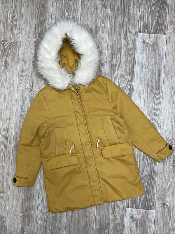 Тепла парка Попереду 4 кишені. Гарне об'ємне хутро (знімне). Підкладка поліестер. Затяжка в талії не діє. Глибокий капюшон 🏷️Zara 11-12 лет/152 Довжина 73. Пог 50. Рукав 53 (+12 плече)