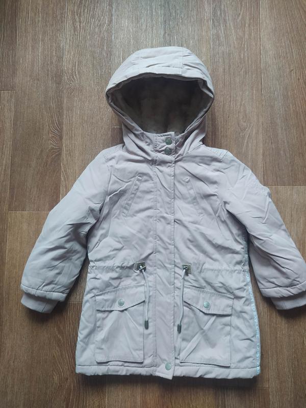 цвет пудровый. есть искусственный мех на капюшоне на пуговицах. Длина от плеча до низа 54, плечо 6, рукав 35+трикотажный манжет 3 см, ширина под руками 39