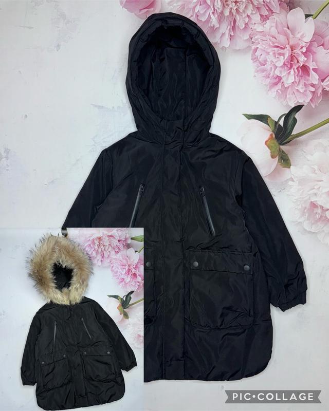 Чёрная парка с карманами Высока горловина Подкладка полиестер Состояние отличное 🏷️Zara 🔹7 лет/122 Длина 65. ПОГ 44. Рукав 42 💰800 грн без меха 💰1200грн с натуральным мехом енота
