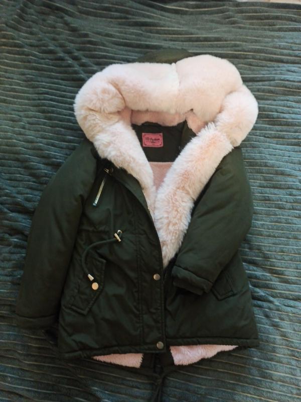 Парка для девочки, цвет хакки, с розовым мехом. очень тёплая и удобная. По наборке на рост 122 см, можно и более. Пояс на кулиске. Из нюансов не хватает пара пуговиц для меха, на нос и вид не влияет.