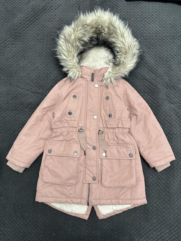 Парка на ріст 110 см, 5 років. В дуже хорошому стані, має лише потертості на застібках( видно на останньому фото). Довжина спереду 52 см, ззаду 61 см, рукав від плеча 39 см.