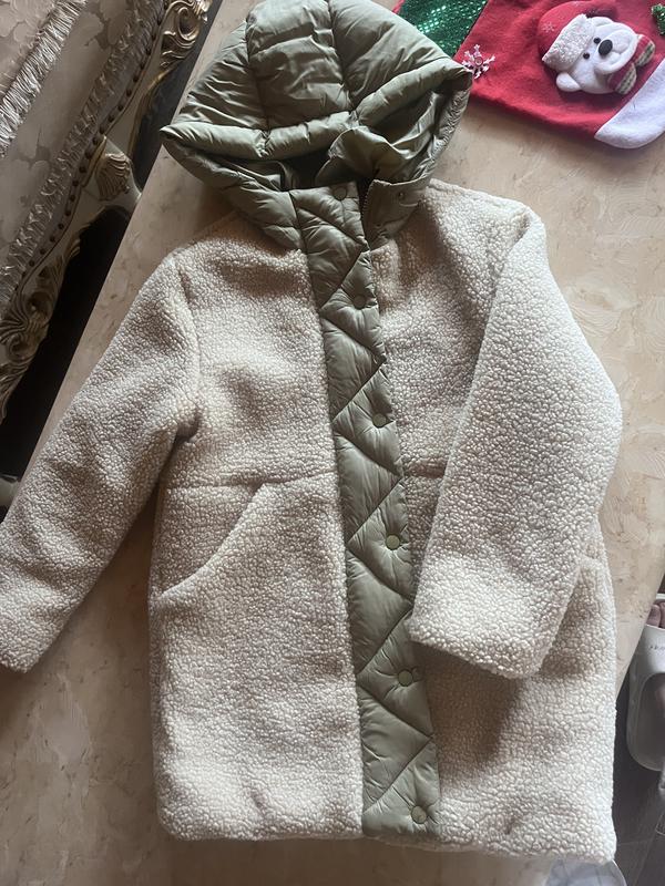 Куртка удлененная Zara Тедди Состояние новой Теплая и красивая) Размер 146-152 Без нюансов На молнии и на кнопках как защита от ветра Есть карманы Капюшон Цвет оливка+тедди молочного цвета