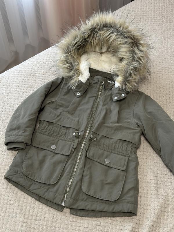 Наша любимая парка от H&M Утепленная мехом на груди и капюшоне, подкладка на запястье, не будет задувать ветер и попадать снег. Капюшон отстёгивается. Подойдет на весну-осень и теплую зиму. Состояние идеальное. Большемерит, носили в 3-4 года Длина 49 Ширина 37 Плечи 30 Рукав 32 (с манжетами 34)