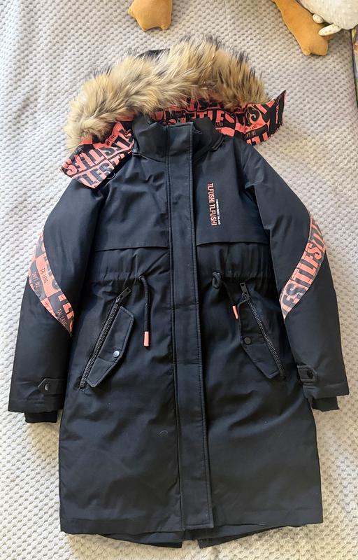 Зимова куртка-парка для дівчинки. Вона має подовжений крій, хутряний капюшон та сучасний дизайн із написами на рукавах та вздовж блискавки, включаючи бренд "TAI LANG". Особливості: Парка виконана в чорному кольорі з яскравими помаранчевими акцентами та написами. Вона оснащена застібкою-блискавкою, що прикрита планкою, регульованою талією на шнурках, кишенями на блискавках та кнопках. Сезонність: Це теплий варіант верхнього одягу, призначений для холодної осені та зими.