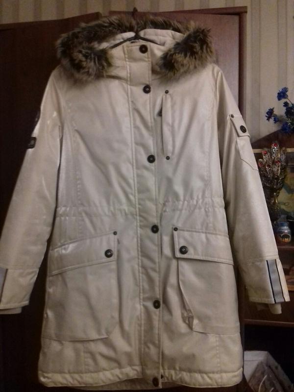 Зимняя парка для девочки красивого молочного оттенка с напылением от известного своим качеством бренда Lenne. Съемный капюшон с опушкой (опушка тоже съемная), на талии затягивается, на рукавах и на спине нашиты светоотражающие элементы. Практически не носилась, состояние отличное. Длина рукава (от плеча) 58см; Длина рукава (от шеи) 71см; ПоГ 53см; Длина 87см