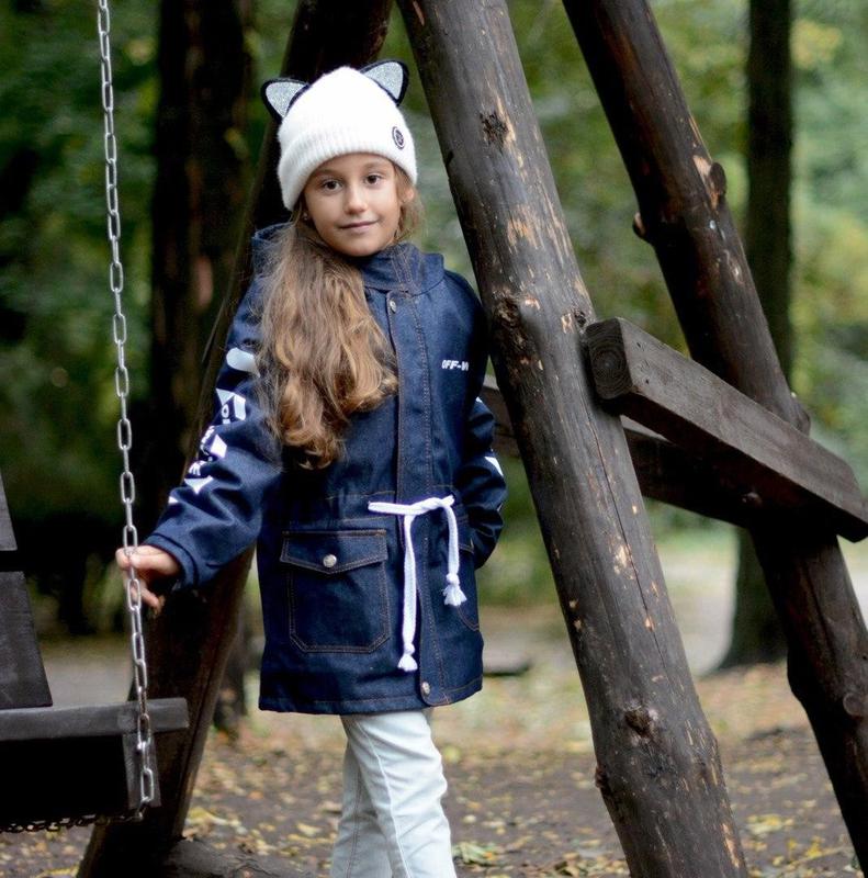 Ткань: натуральный варенный джинс, подкладка - мех, в рукавах силикон 150 Застегивается на молнию, которая скрыта дополнительным клапаном на кнопках, на поясе шнурок, горловина прикрыта дополнительным клапаном Принт: накат Цвет: голубой и синий джинс Размеры: 128, 134, 140, 146, 152.
